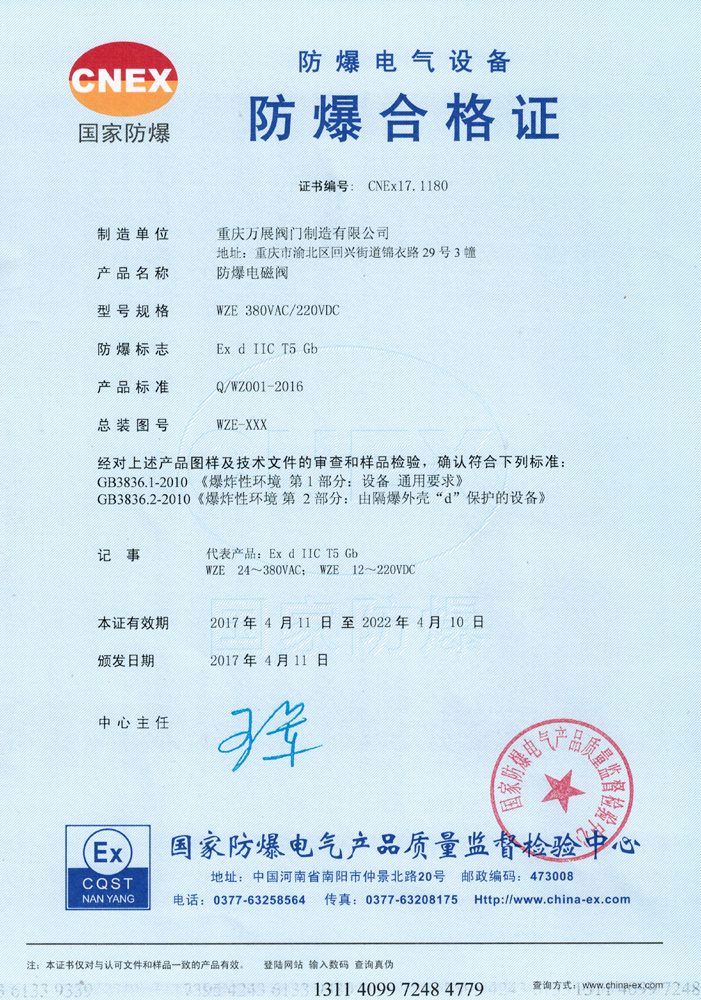 恭喜我司獲得防爆電磁閥合格證。