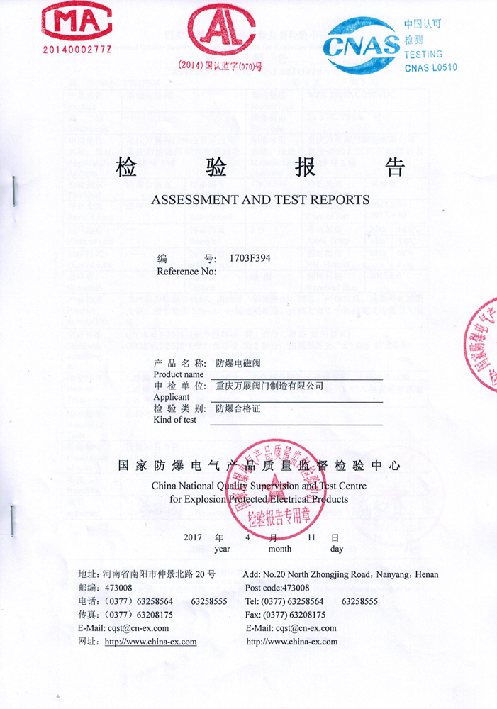 我司獲得的防爆電磁閥合格證標(biāo)志為"ExdⅠ/ⅡCT5","Ex"為通用符號,表示explosive,"d"表示次防爆型式為"隔爆型d"."Ⅰ"或"Ⅱ"表示電氣設(shè)備分類,Ⅰ為煤礦用電氣設(shè)備,Ⅱ?yàn)槌旱V外其它爆炸性氣體環(huán)境用設(shè)備.其中,Ⅱ類隔爆型"d”電氣設(shè)備又分為ⅡA,ⅡB和ⅡC類."T5"表示溫度組別。此等級屬國內(nèi)電磁閥的高等級,象征我司的防爆電磁閥已達(dá)到國內(nèi)外高級水平,歡迎新老客戶訂購。