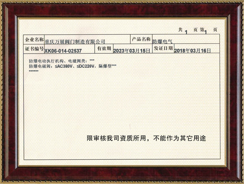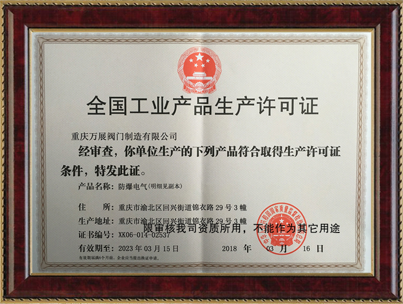 我司順利通過(guò)國(guó)家質(zhì)量監(jiān)督檢驗(yàn)檢疫總局的各項(xiàng)審核,成功取得了《全國(guó)工業(yè)產(chǎn)品生產(chǎn)許可證》,獲得了防爆電磁閥生產(chǎn)資格,促進(jìn)公司防爆電磁閥生產(chǎn)管理工作的制度化、規(guī)范化。